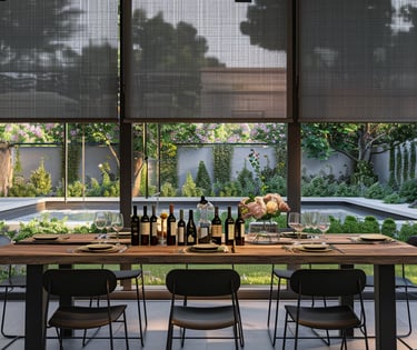 Outdoor blinds enhance outdoor areas, courtyards, and green spaces by allowing natural light, fresh air, and scenic views, all while improving your connection to the outdoors. They provide protection from the sun, wind, and rain, offering shade on hot sunny days.